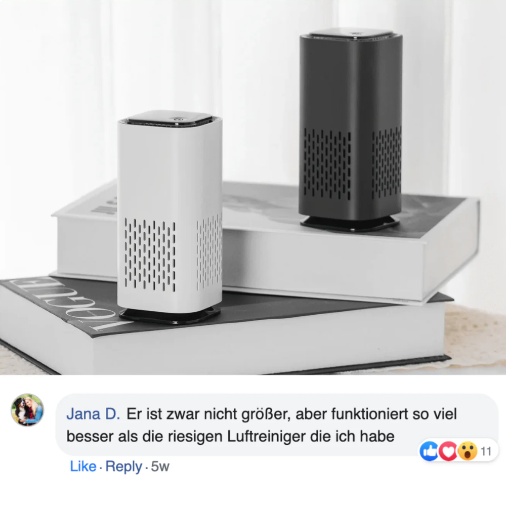 Erlebe die Kraft und Effizienz eines großen Luftreinigers in einem kompakten, stilvollen Gerät, das keinen riesigen Platz einnimmt und nicht 400€ kostet wie andere größere Modelle.