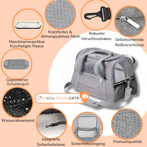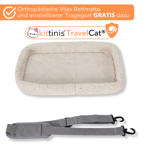 Mit der KITTINIS™ "TRAVELCAT"® Transporttasche wird jede Reise für deine Katze so angenehm wie möglich! Als besonderes Extra erhältst du eine orthopädische Vlies-Bettmatte und einen einstellbaren Tragegurt GRATIS dazu.
